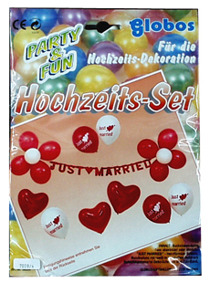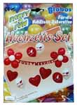 Hochzeits-Set, Buchstabenkette, Herzförmige Ballons, Runde Ballons rot/weiß, mit und ohne Aufdruck, Befestigungsmaterial, Deko-Scheiben und Polyband |